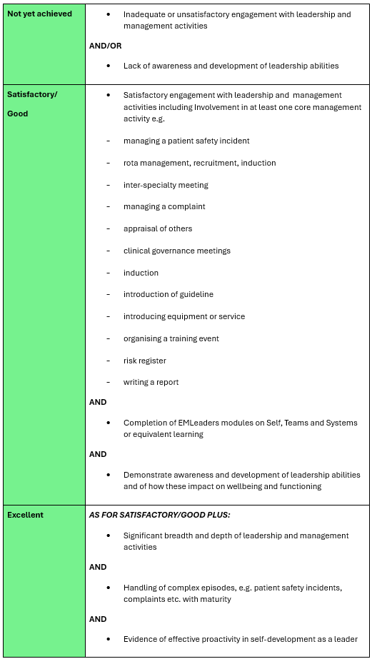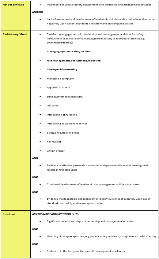 Leadership and management are formally set out within the Programmes of Learning and Assessment from intermediate training onwards and the requirements of the curriculum reflect growing expertise and responsibility in this subject over time.